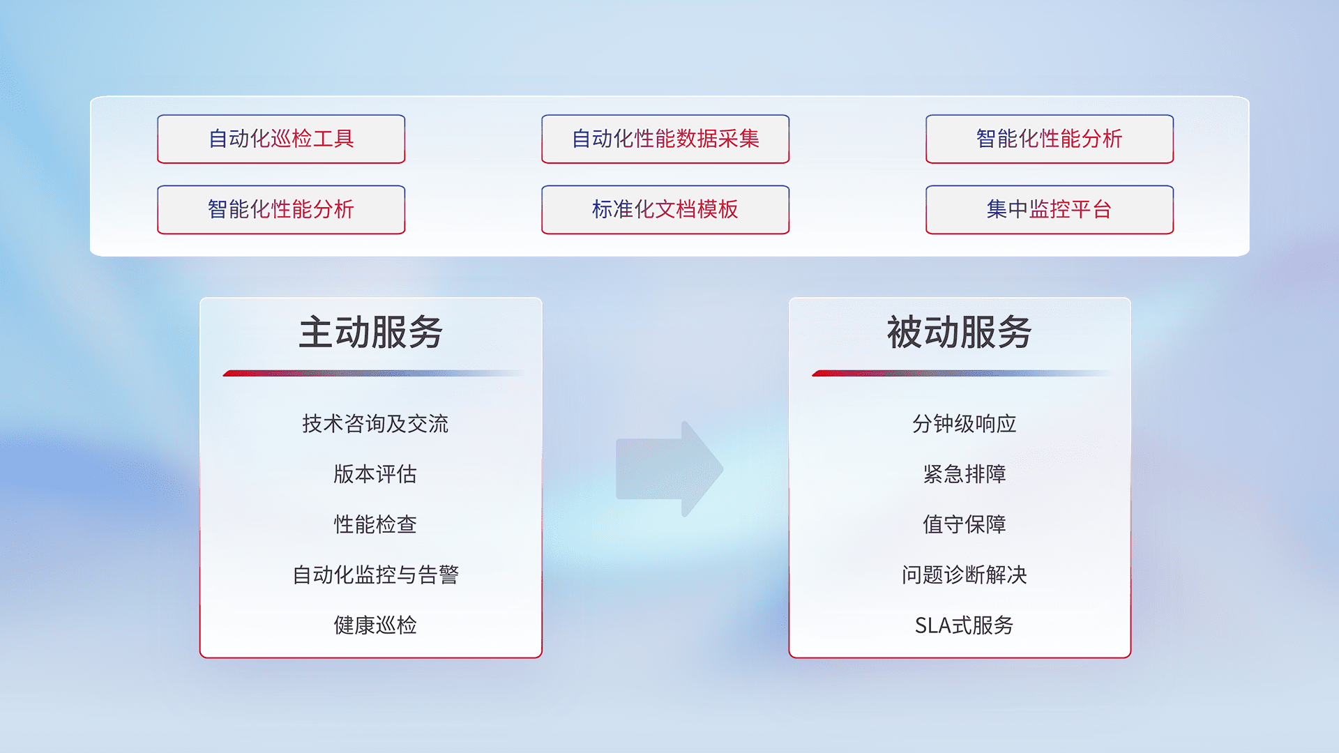 智能化工具和标准化文档,,,,保障服务质量,,提供主动服务(包含技术咨询、、版本评估、、、性能检查、、、自动化监控与告警、、、、健康巡检)和被动服务包含(分钟级响应、、、紧急排障、、值守保障、、、、问题诊断解决、、、、SLA服务)。。