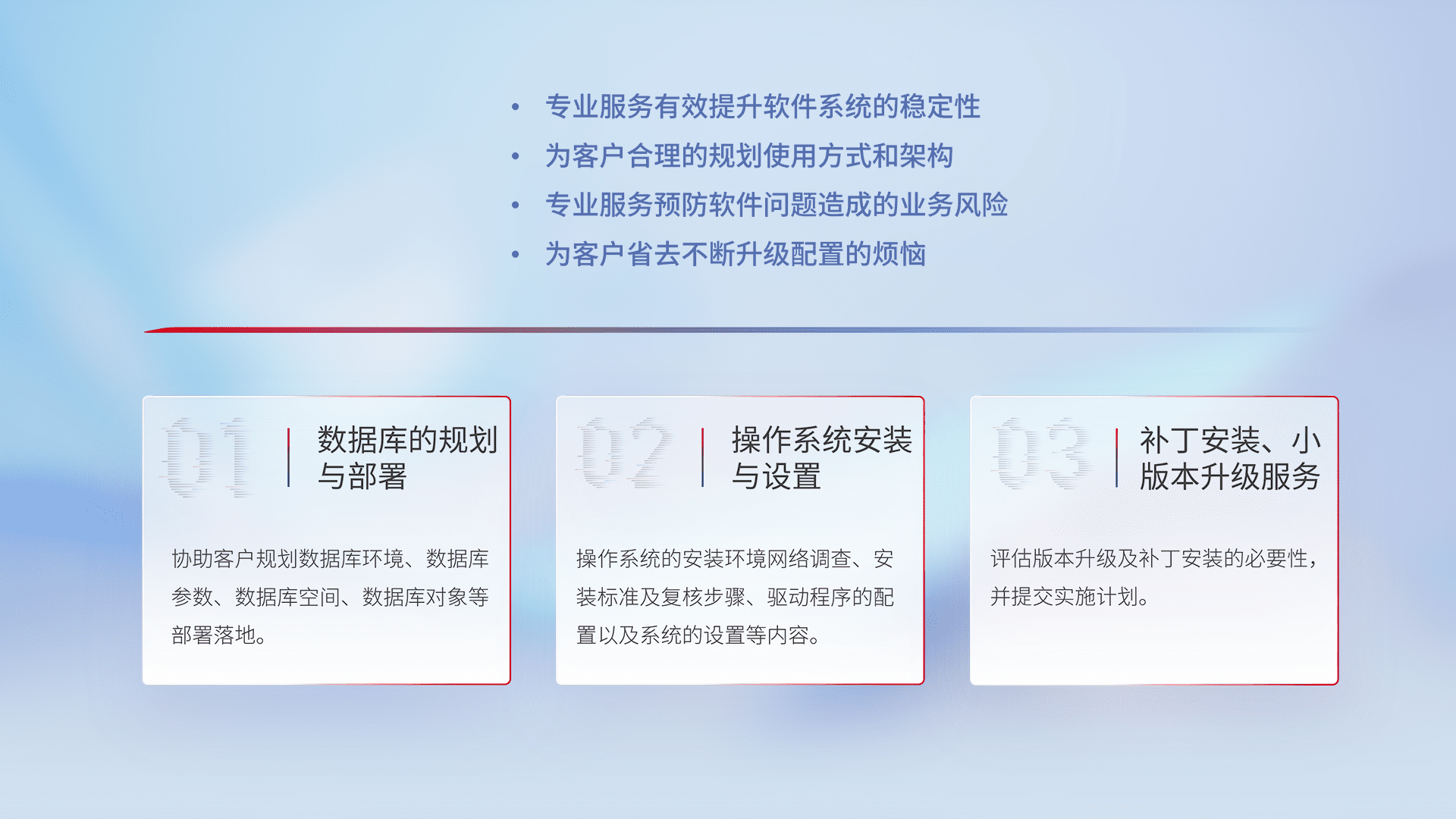 为客户提供软件规模升级、、快速部署、、按需配置的专业服务,,,从数据库的规划与部署到操作系统的安装与设置,,再到补丁安装和小版本升级提供支持。。。。